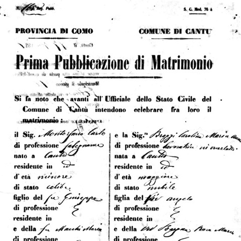 Ya vimos que en el bautismo muchas veces se omiten los datos de la madre por lo que el matrimonio, del antes bautizado, es a menudo la única fuente donde se cita el apellido de la madre. Y debemos tener en cuenta que la tradición italiana era celebrar el matrimonio en la parroquia de la novia, cuestión que nos puede complicar la investigación si ésta proviene de un pueblo diferente al de su marido.